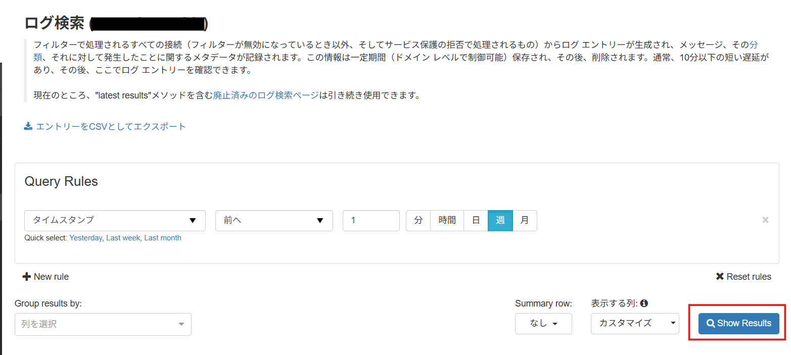 検索期間を指定できます。デフォルトでは「前へ」「1週」と指定されておりますが、これは、過去1週間分のログを表示します。 - フィルタリングホスト