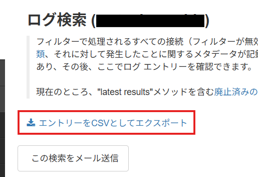 「エントリーをCSVとしてエクスポート」をクリックされますと、検索結果をCSV形式でダウンロードすることが可能です。
