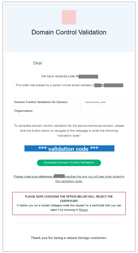 お支払が完了いたしますと、お客様にご登録していただきました管理者メールアドレス宛てに、Sectigo(旧名:Comodo)から「ORDER #XXXX – Domain Control Validation for ドメイン名」という件名の英文の承認メールが到着いたします。