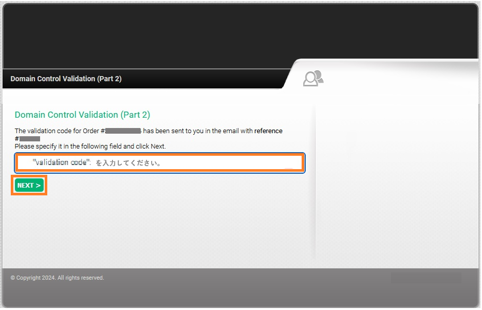 表示された画面にて、”validation code”を入力し、「NEXT」をクリックしてください。