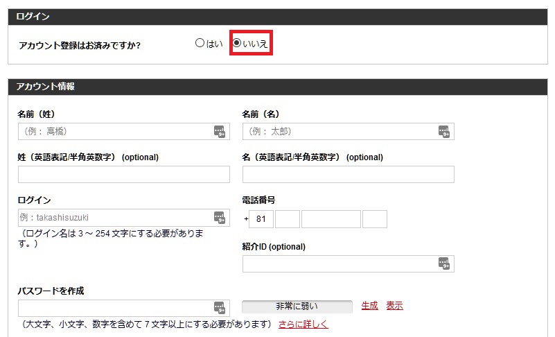 6. アカウント登録はお済みですか? には いいえ にチェックを入れ、必要事項を入力します。