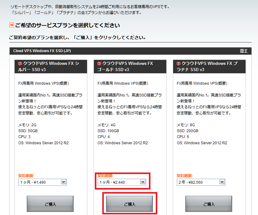 3. 申込みしたいプランの期間を選択して、 ご購入 をクリックします。