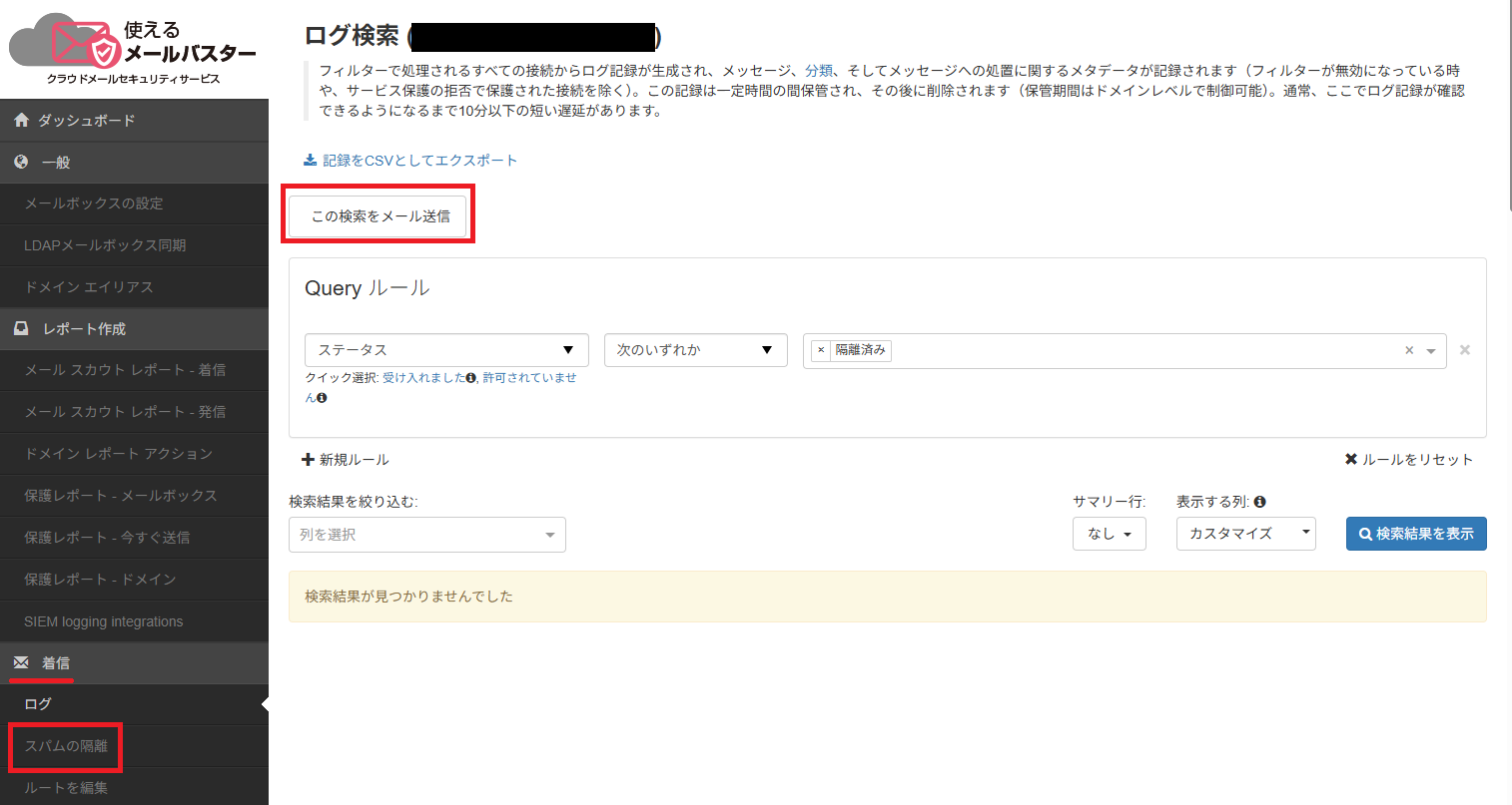 メールスカウトレポートはドメインレベルのコントロールパネルの【着信】→【ログ】から作成することができます。