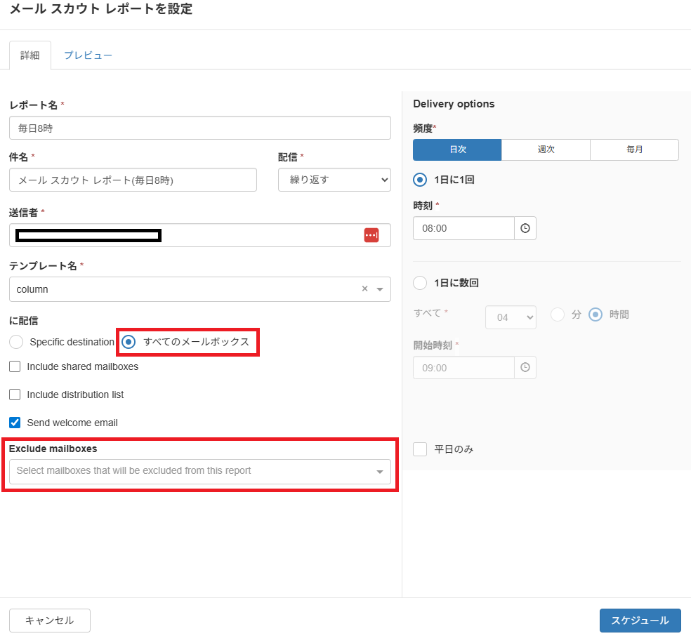 ・Exclude mailboxes:レポートメールが不要なメールアドレスを入力