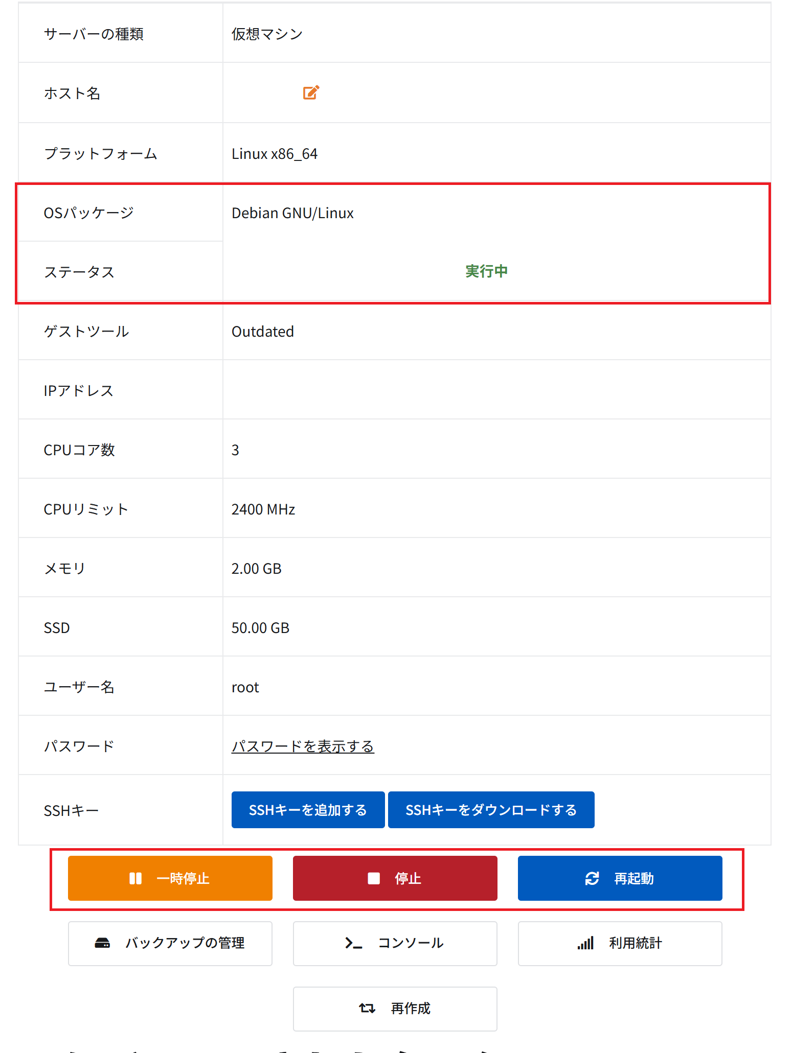 VPSの停止、起動、再起動は、管理ページから実行することができます。