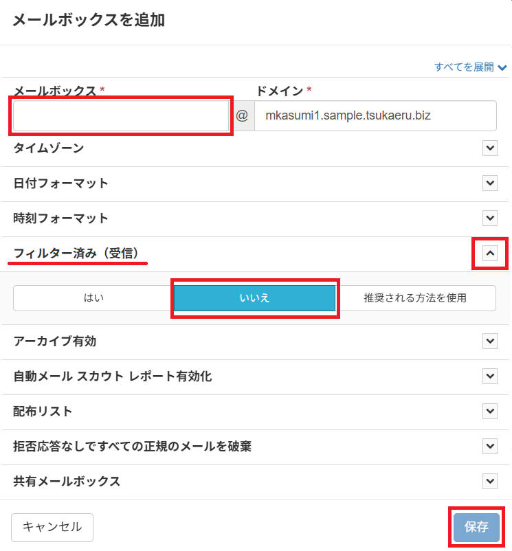 『フィルター済み(受信)』のプルダウンをクリックし『いいえ』を選択して保存します。