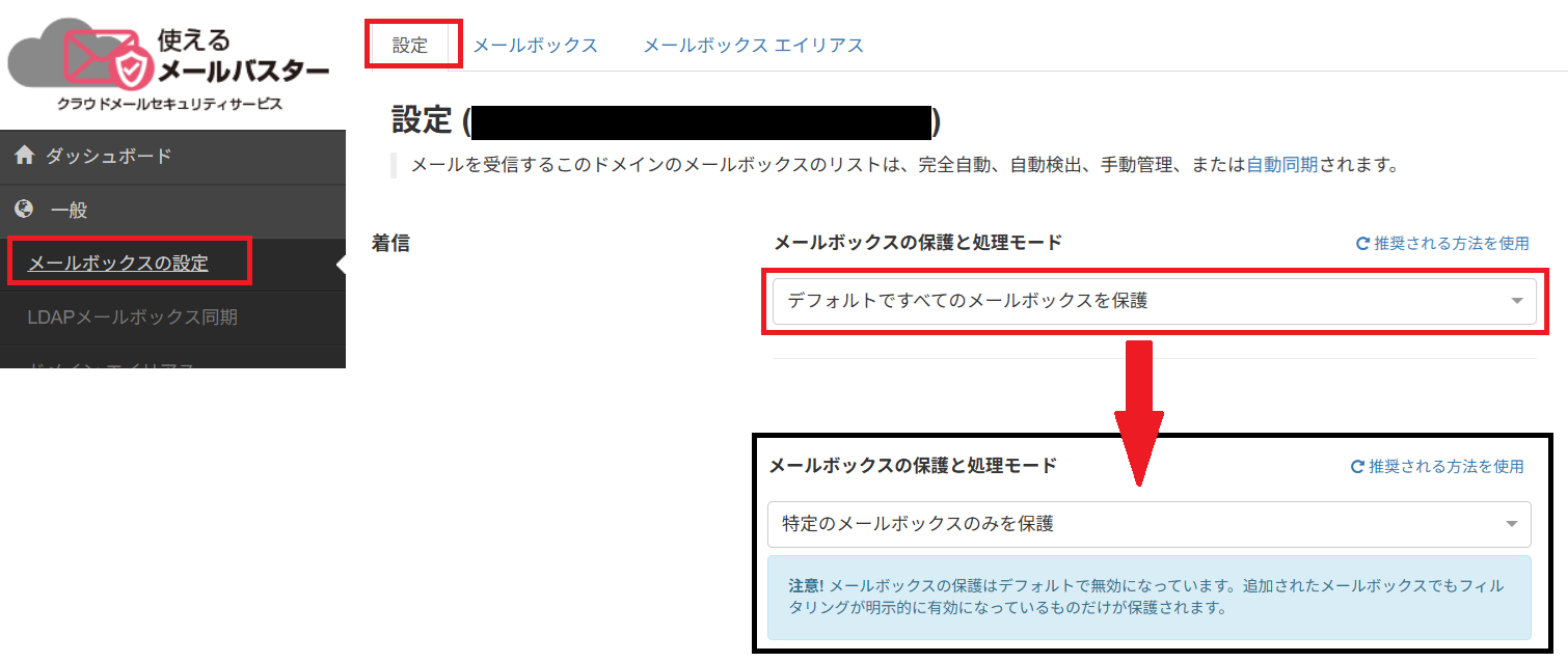 『メールボックスの保護と処理モード』を『デフォルトですべてのメールボックスを保護』 から特定のメールボックスのみを保護 に変更します。