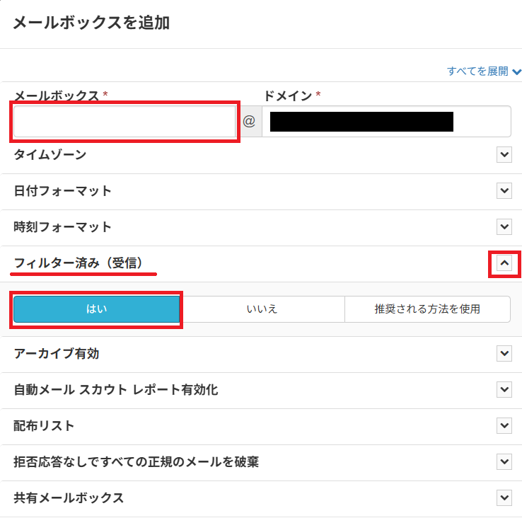『フィルター済み(受信)』のプルダウンをクリックし『はい』を選択して保存します。