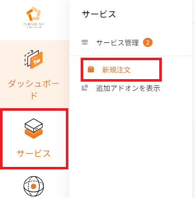 2. 画面左側のメニュー【サービス】より、【新規注文】を選択します。