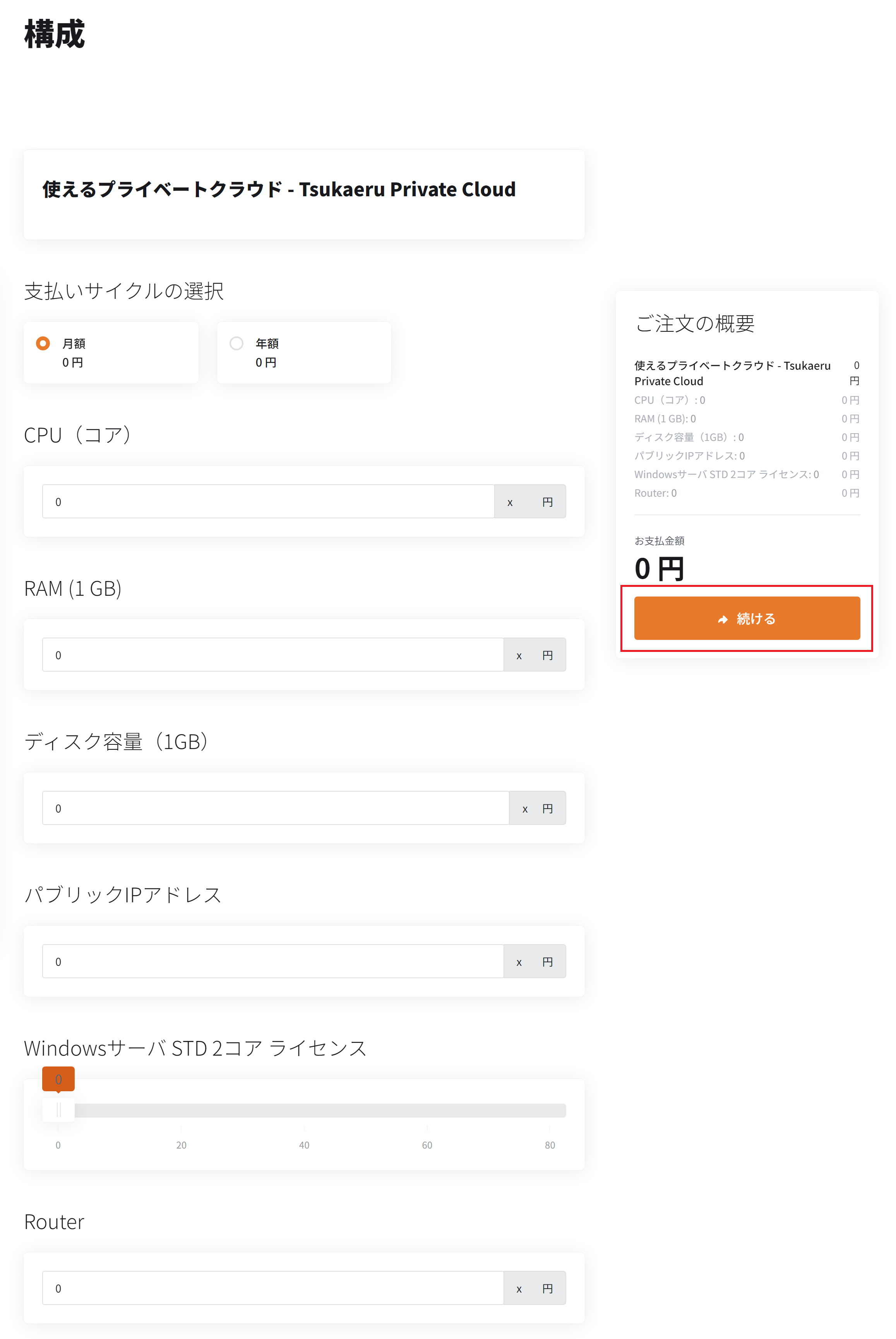 5. 支払いサイクルおよびプライベートクラウドの構成を選択し、【続ける】をクリックします。