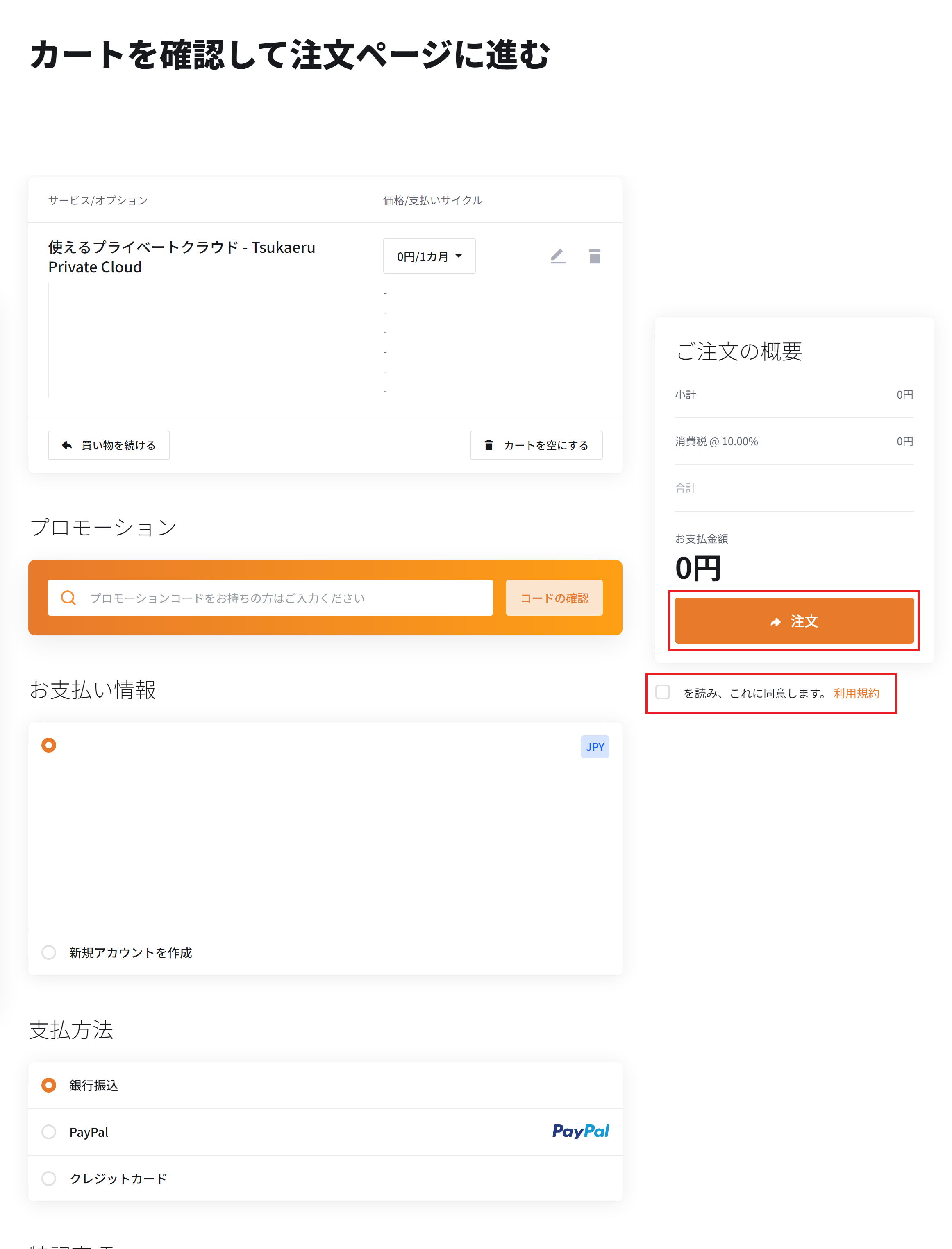6. 注文内容、支払い方法等を確認し、利用規約に同意のチェックを入れたのちに【注文】をクリックして注文を確定させます。