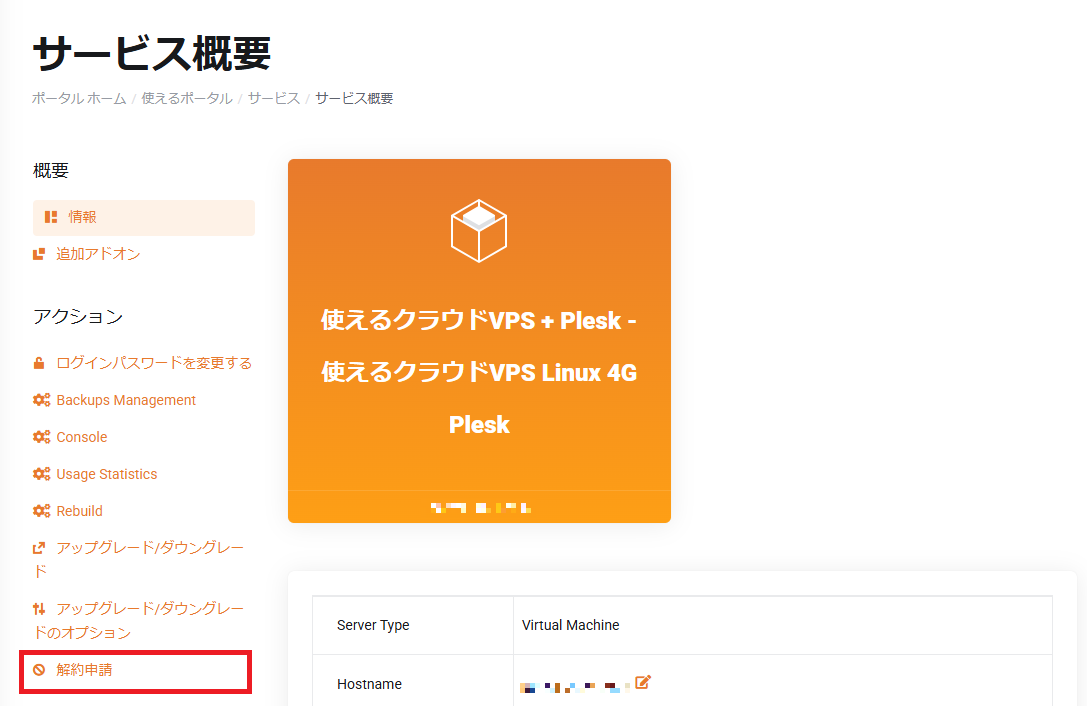 - 「解約理由」を記述し、「解約の種類」を選択してから「解約申請」をクリックします。