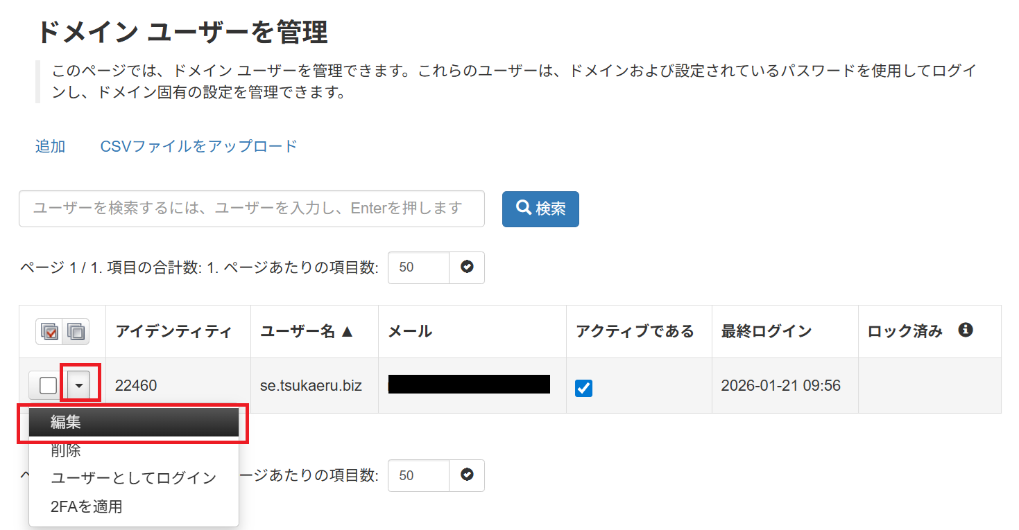 - 「ユーザーと権限」>「ドメインユーザーを管理」メニューを開きます。
