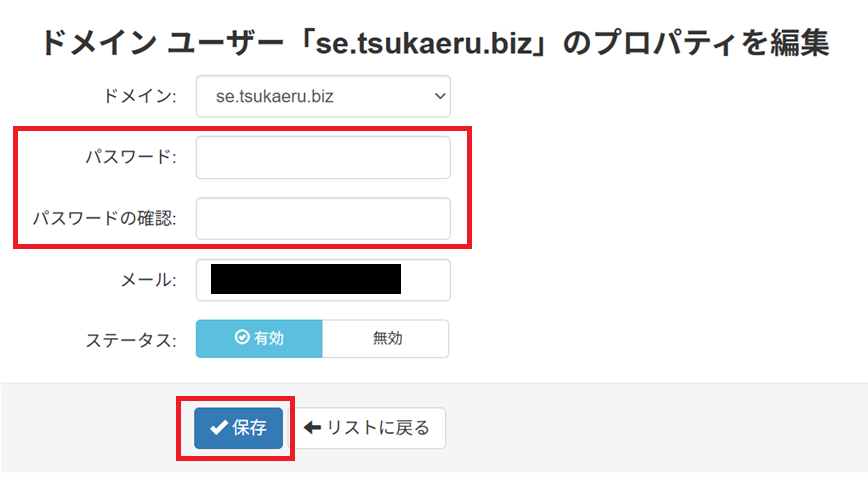 ユーザー名/ドメイン/メール:上記で設定したお客様のドメイン名を入力してください。(tsukaeru.netはあくまで入力例です)